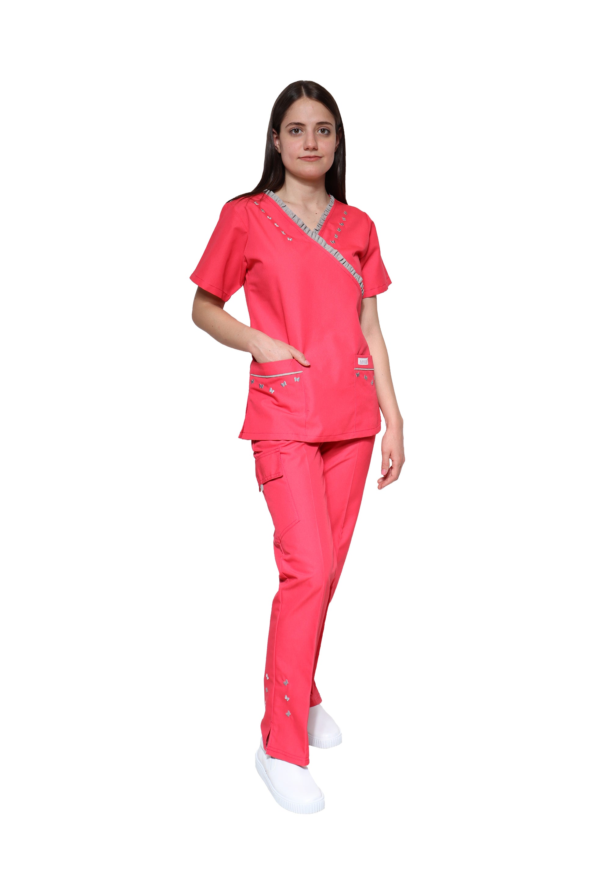 - DISEÑO DE PANTALÓN - Pantalón con corte moderno con silueta muy femenina, es el más cómodo por su pretina ancha en la parte de la cintura. Amplias bolsas de cargo laterales. Detalle de maripositas en el pantalón en la parte inferior. Brinda el ajuste perfecto. Es el pantalón más cómodo y bonito del mercado, un gran diferenciador y de los más queridos y reconocidos por los profesionales.