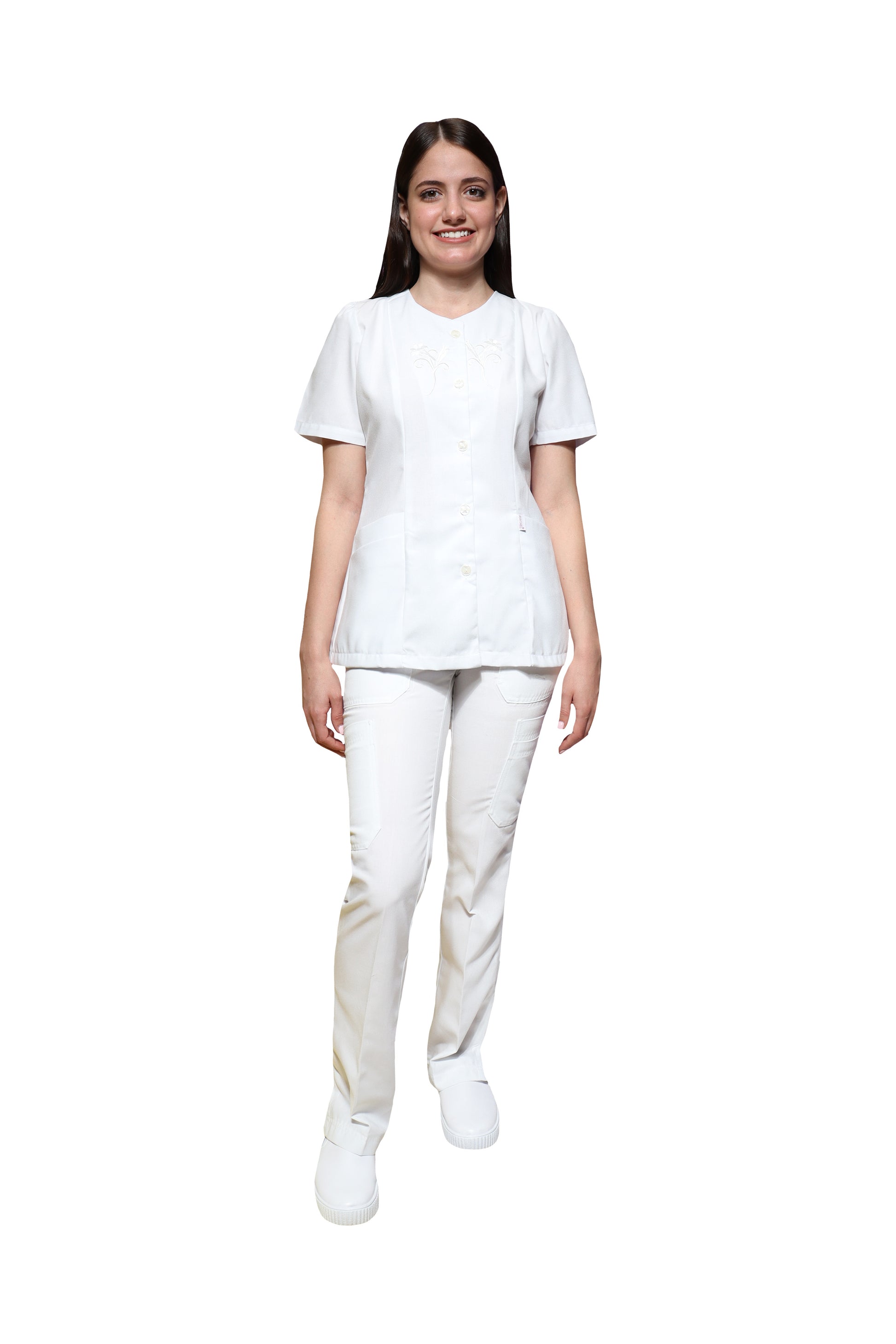 • Filip AI-108- Filipina Manga corta, nuestro clásico cuello de vestir, con cierre frontal, delicado bordado en las mangas, amplias bolsas delanteras con elegantes vivos de costura. Hermoso y juvenil corte con silueta femenina.