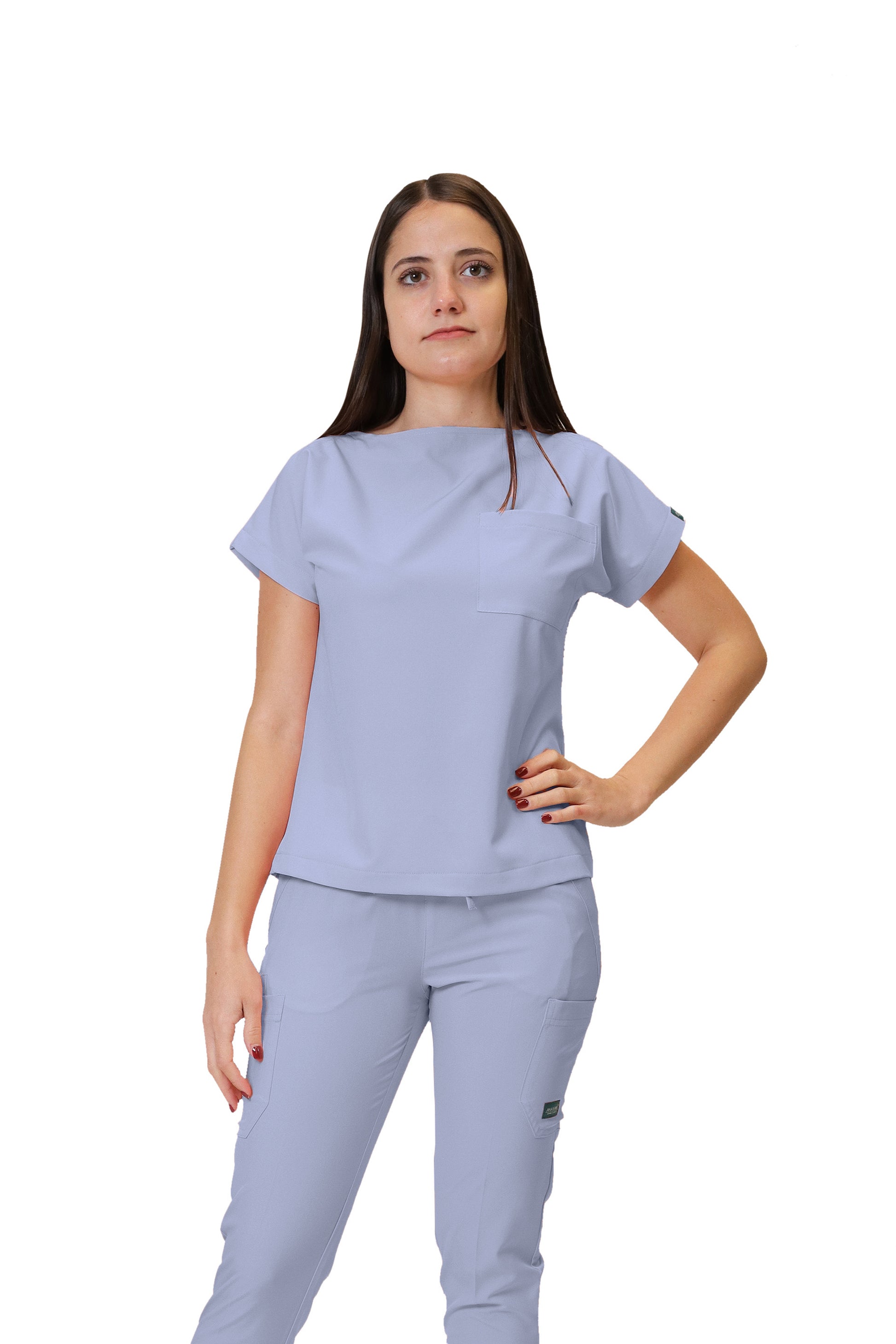 - DISEÑO DE FILIPINA - Filipina manga corta y cuello REDONDO TIPO BLUSA, con 1 amplia bolsa delantera. Hermoso y juvenil corte con silueta femenina. La composición textil de esta filipina es 96% Poliéster y 4% Elastáno para que ambos materiales creen una prenda muy cómoda y duradera.