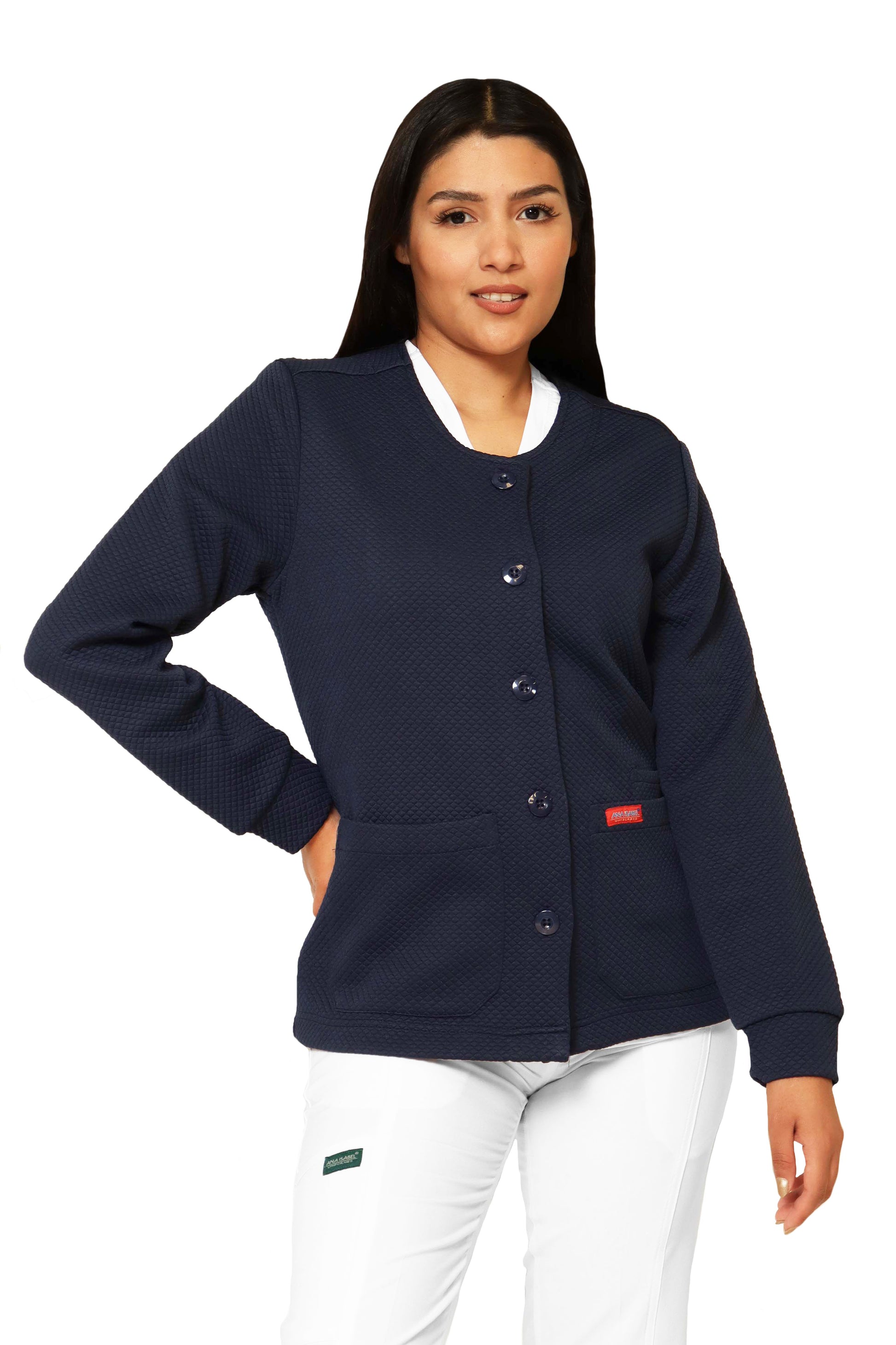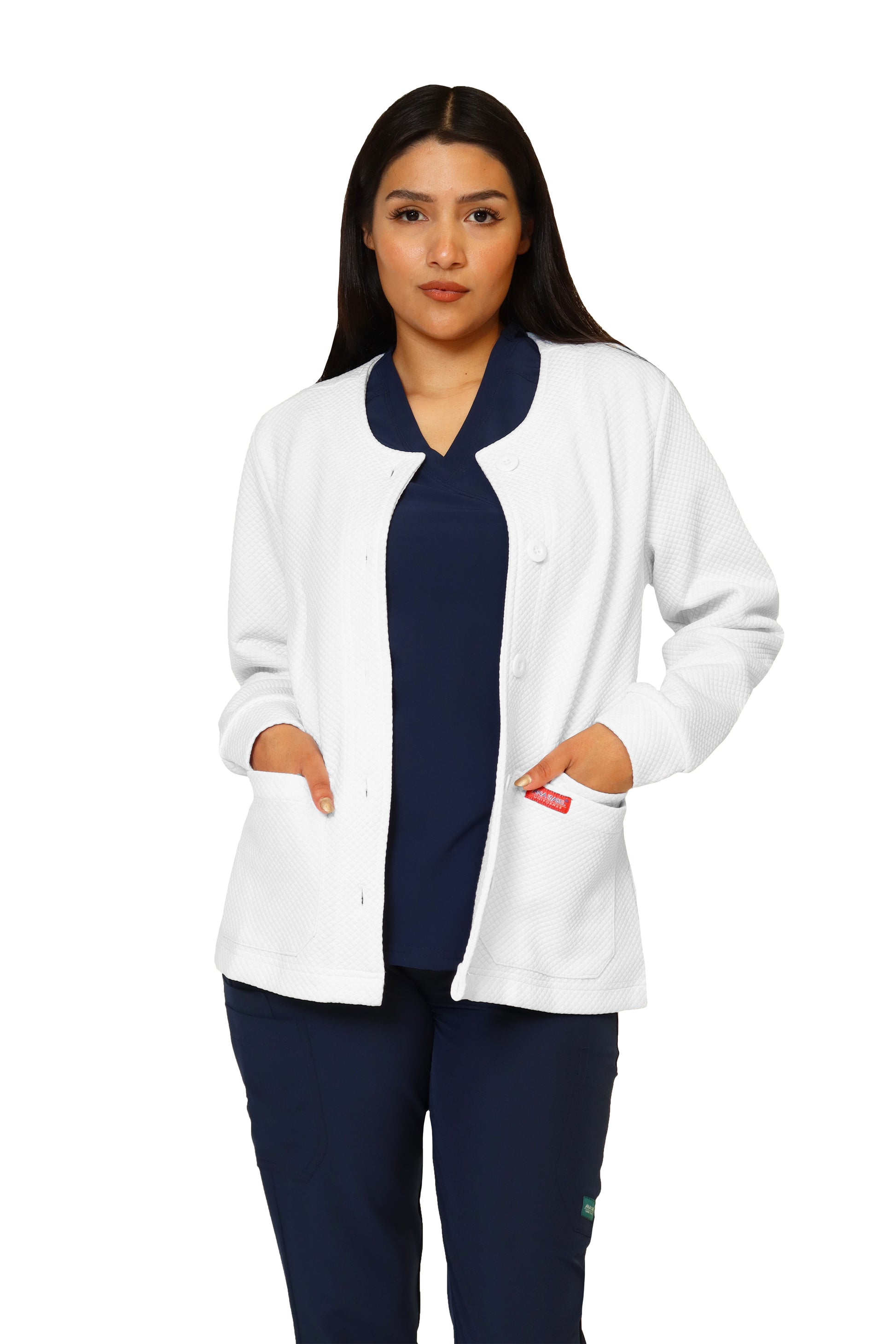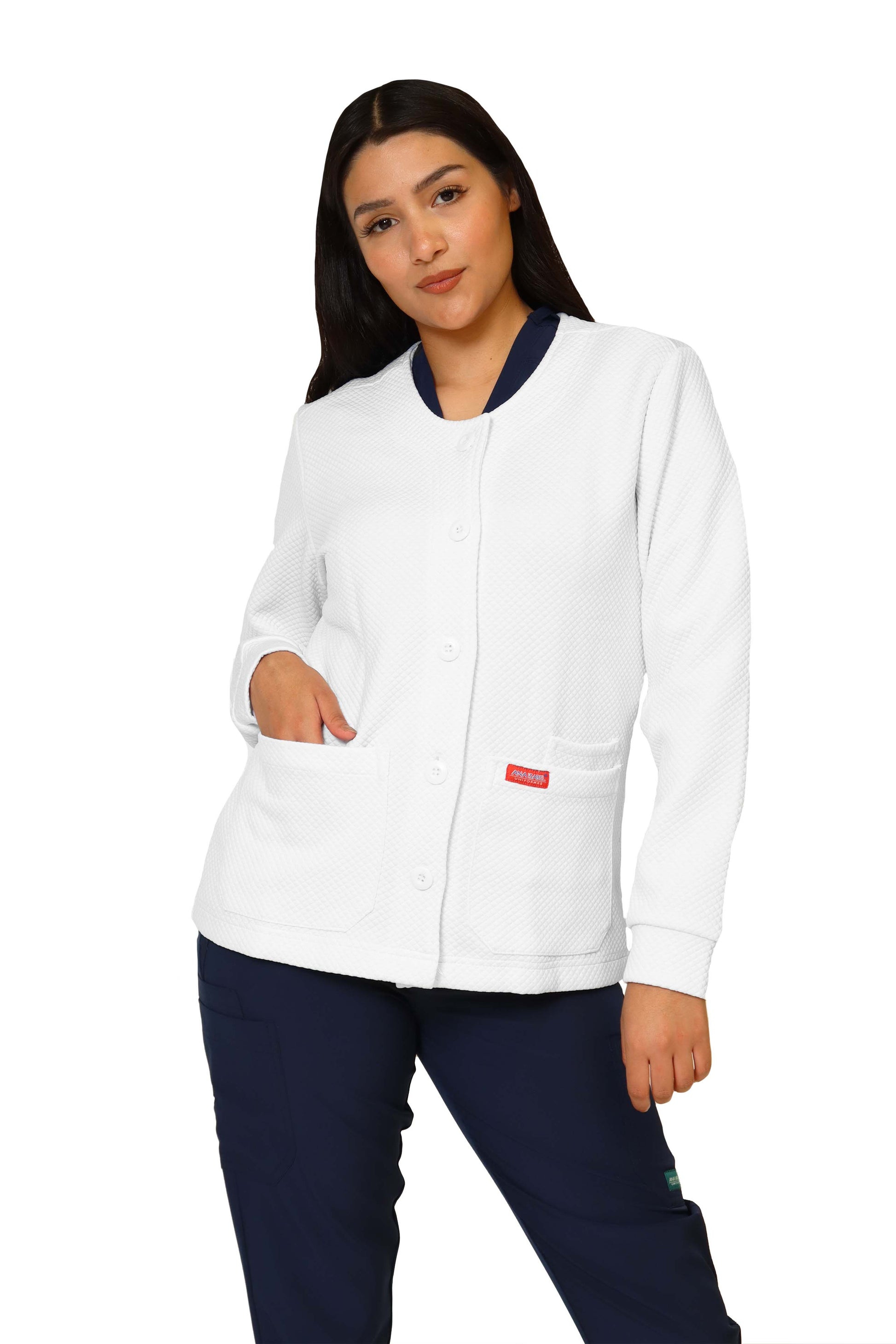 - DISEÑO DE WARM UP(CHAMARRA MÉDICA) – Bata Dama Corta Sport tipo WARM-UP CON TELA CAPITONADA de manga larga con puño, silueta super femenina, cinco hermosos botones y dos amplias bolsas reforzadas. Hermoso y juvenil corte con silueta. La composición textil de este WARM-UP es 96% Poliéster y 4% Elastano para que ambos materiales creen una prenda muy cómoda y duradera.
