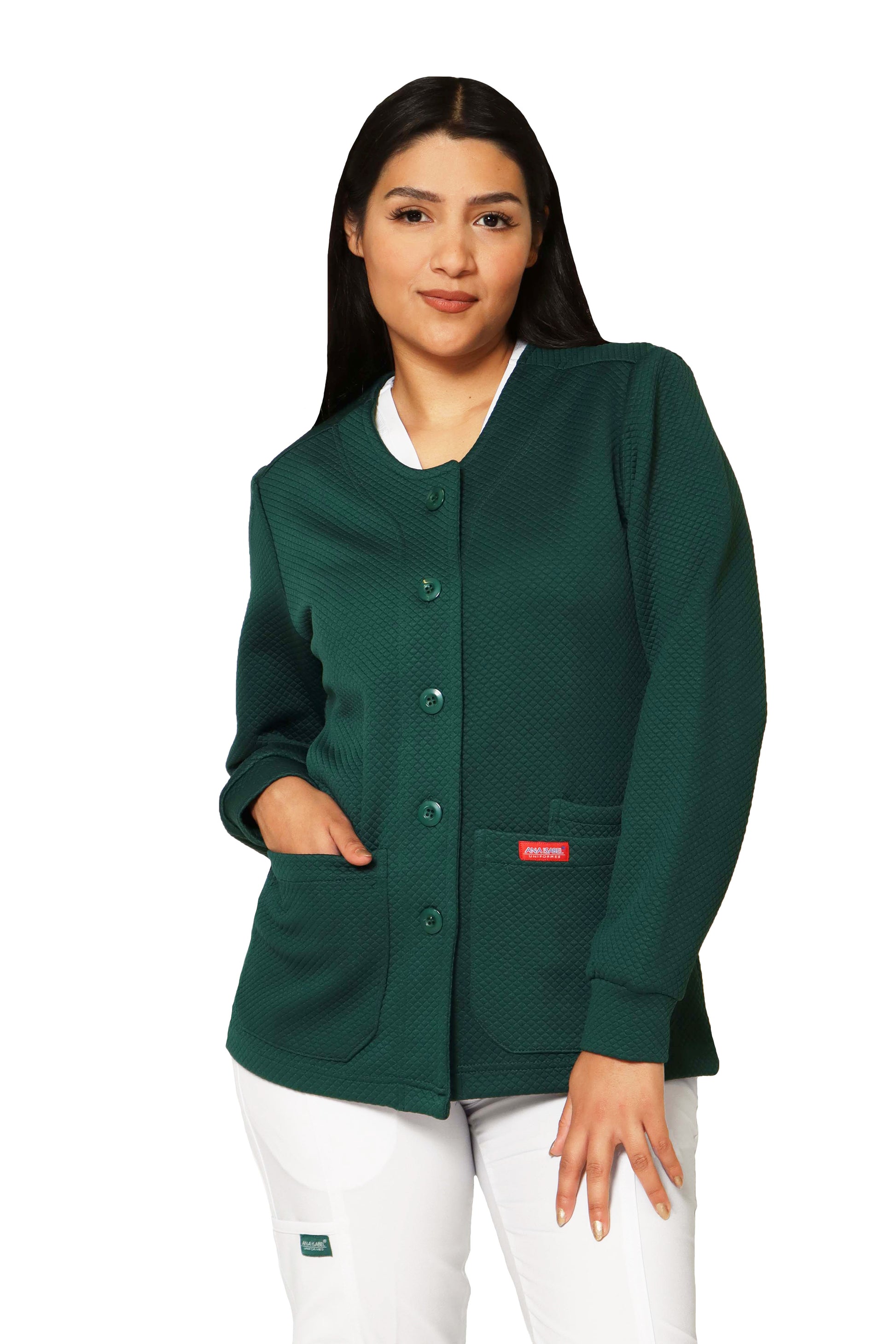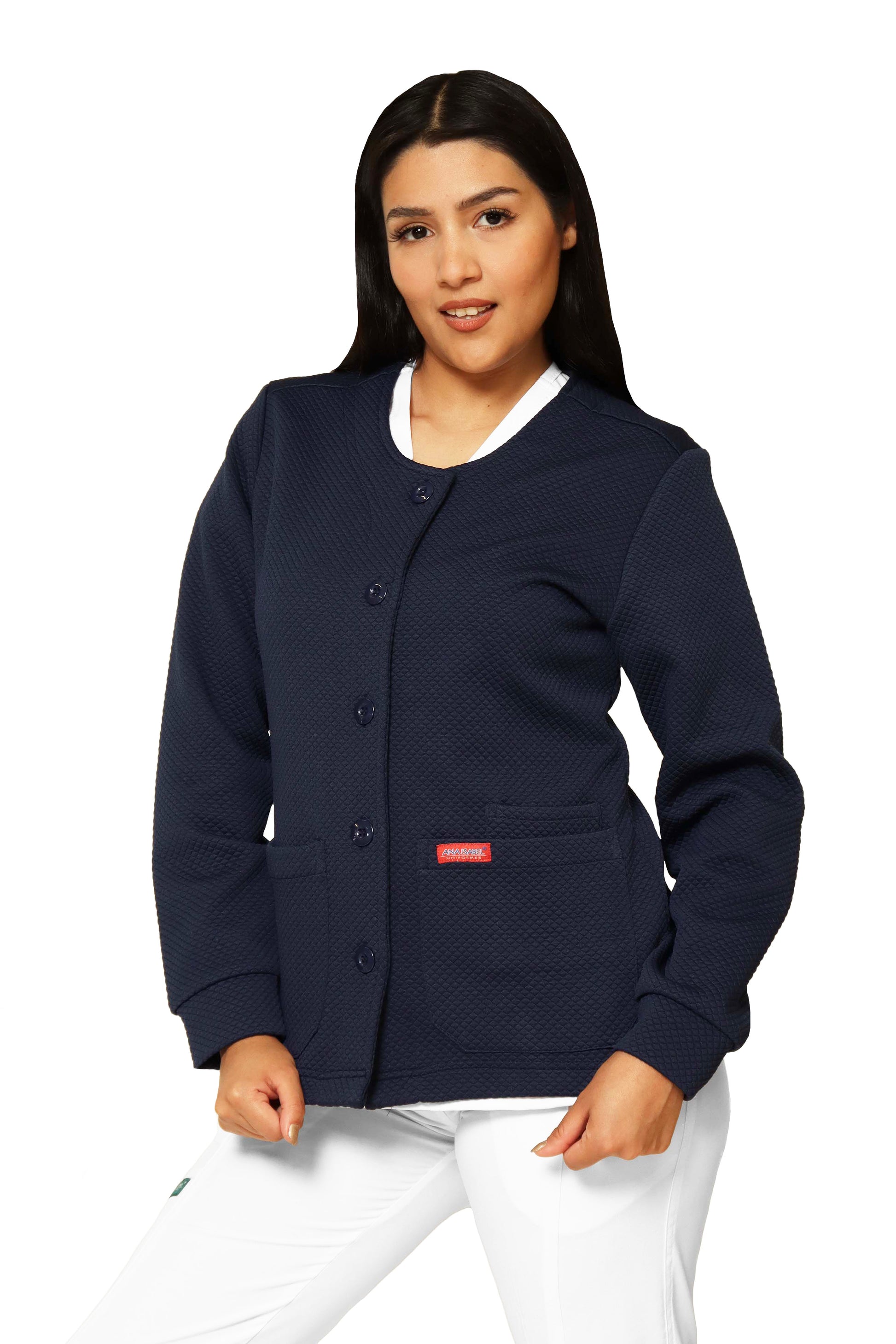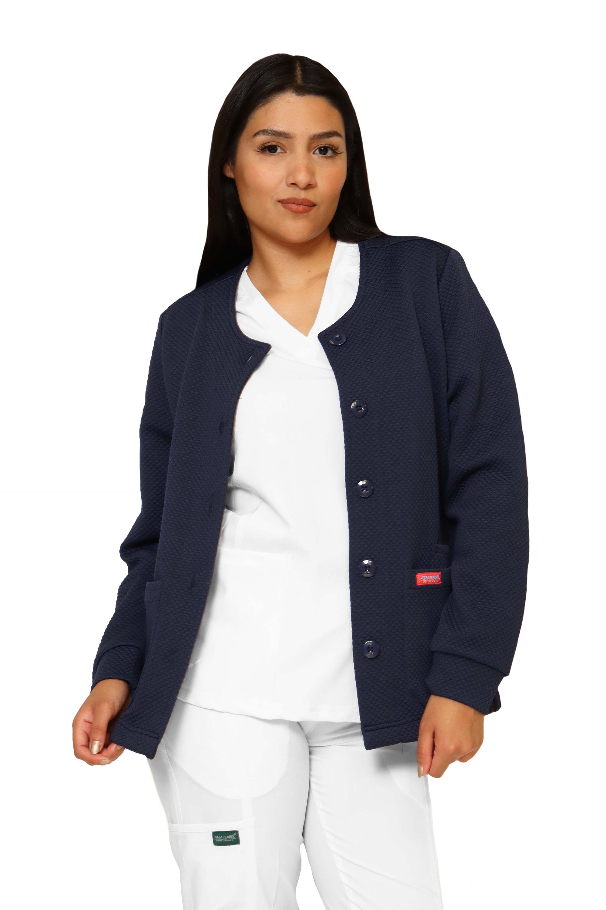- DISEÑO DE WARM UP(CHAMARRA MÉDICA) – Bata Dama Corta Sport tipo WARM-UP CON TELA CAPITONADA de manga larga con puño, silueta super femenina, cinco hermosos botones y dos amplias bolsas reforzadas. Hermoso y juvenil corte con silueta. La composición textil de este WARM-UP es 96% Poliéster y 4% Elastano para que ambos materiales creen una prenda muy cómoda y duradera.